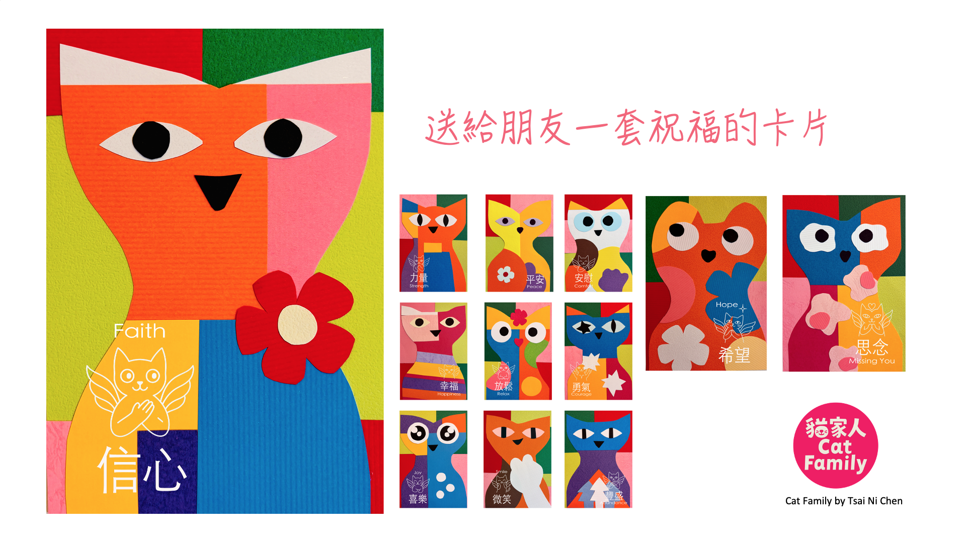 貓家人祝福卡一套12張(平安、希望、安慰、信心、力量、放鬆、幸福、勇氣、思念、喜樂、微笑、豐盛)祝福朋友最合宜。