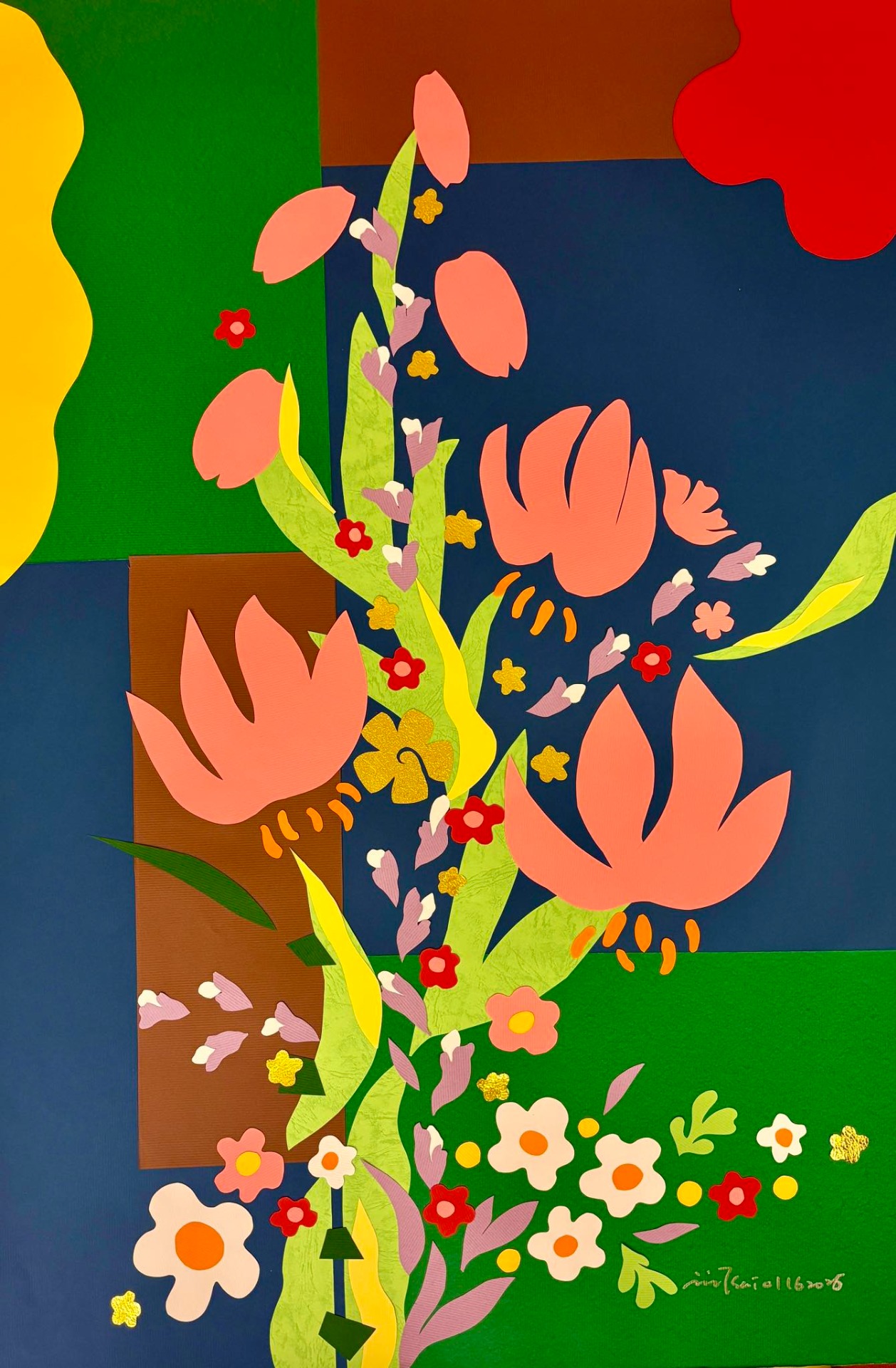 我的創作以彩紙拼貼為主要媒材,關注色彩、形狀與空間之間的關係,並透過長期系列的方式,回應信仰、記憶與日常生活中的感受。